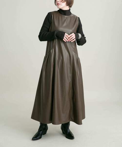 【モードな着こなしを叶えるジャンパースカートが登場】 フェイクレザーで仕上げたジャンパースカート。ポケット~背中の低めの切り替えや、広がり過ぎないフレアシルエットが大人っぽさを演出します。ほっこり見えしないのでモードなスタイルがお好きに方にもおすすめの1着です。 COORDINATE タートルやハイネックニットを合わせるとより女性らしい着こなしに。ジャケットやカーディガンなどを羽織ると大人っぽさが引き立ちます。 【2023 Autumn/Winter】 ※この商品は、素材の特性上、着用の経過と共に徐々に劣化します。 ※乾熱アイロン、スチームアイロンは、かけないでください。 ※その他お取り扱いに関しましては、商品に付属のアテンションタグをご覧ください。 ※商品画像は、光の当たり具合やパソコンなどの閲覧環境により、実際の色味と異なって見える場合がございます。予めご了承ください。 ※商品の色味の目安は、商品単体の画像をご参照ください。 ▼お気に入り登録のおすすめ▼ お気に入り登録商品は、マイページにて現在の価格情報や在庫状況の確認が可能です。 お買い物リストの管理に是非ご利用下さい。 素材感 透け感 : なし 伸縮性 : なし 裏地 : なし 光沢 : あり ポケット : あり