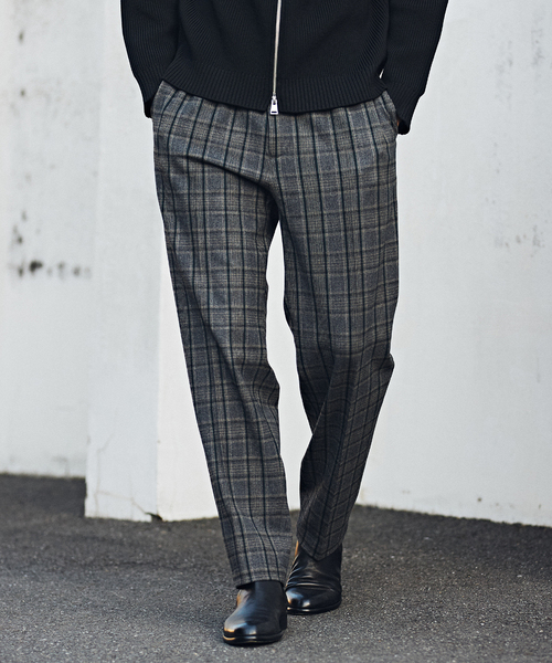 ■デザイン スラックスのようにすっきりとした腰回り、裾に向かってゆるやかなテーパードしたシルエット。リラックスしたイージーな着用感とスラックスのような品のあるきれいさを併せ持っているのが特徴です。落ち着きのあるチェック柄とストライプ柄が程よいアクセントになります。 ■素材 コットンライクな起毛素材を使用。ストレッチ性が高く、モチっとした弾力感も特徴的です。起毛感のある生地を使用しているので肌あたりも良く、保温性も高いです。 ※こちらの商品は23AW冬のセール対象外です。 ********************** 透け感:なし 裏地:なし 伸縮性:あり 光沢感:なし 生地の厚さ:普通 ********************** 【スタッフ着用コメント】 《スタッフA》 身長:181cm/体重:65kg/普段サイズ:L/着用サイズ:L サイズ感:程よくゆとりのあるサイズ感 素材感:柔らかな素材感 着心地:ゆとりがあるので動きやすく、イージー仕様なので履きやすいです ********************** 【ご注意】 ※照明の関係により、実際よりも色味が違って見える場合があります。 またパソコン・スマートフォンなどの環境により、若干製品と画像のカラーが異なる場合もございます。 ※商品の色味は、商品アップ画像をご参照ください。 モデルサイズ:身長:179cm 着用サイズ:L 本体:手洗い可能