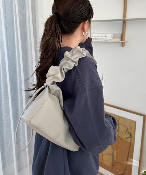 ギャザーデザインが目を惹くショルダーバッグ。 コンパクトなシルエットのショルダーバッグ。クシュっとしたギャザーのショルダーがポイント◎ショルダー部分は伸ばしても使えるので、コーディネートによって雰囲気を変えられます♪プレーンな合皮を使用しているので、甘いイメージのギャザーハンドルですが甘くなりすぎず、カジュアルなコーディネートにもぴったりです。コンパクトながらもマチ付きでしっかりと荷物が入ります◎カラー展開はアイボリー・グレー・ブラックのベーシックカラーの展開です。