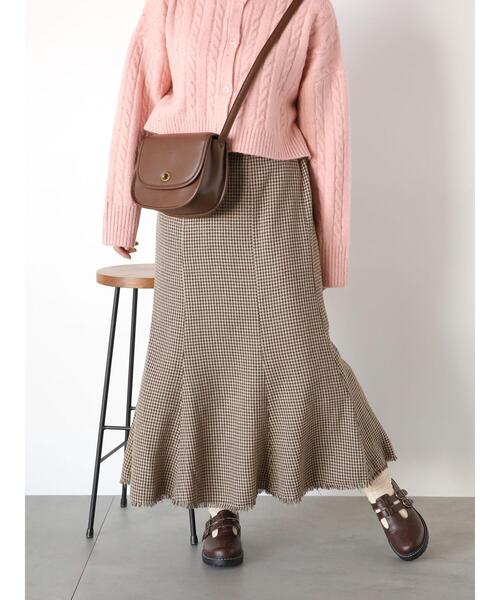裾のフリンジディテールがポイントになったツイードマーメイドスカート。 フィットフレアなシルエットで、女性らしい美スタイルを演出します。 落ち着いた色合いで品良くスタイリングでき、日常使いからオフィスカジュアル、休日のお出かけにと幅広く活躍してくれるアイテムです。 【その他採寸】 F ウエスト:[後ゴム仕様]63cm