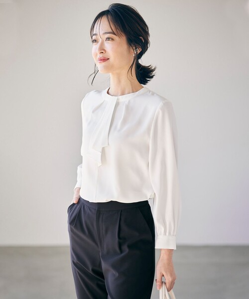 一枚でサマ見え!きちんと感のあるきれいめボウタイブラウス■デザインボウタイデザインがポイントのプルオーバーブラウス。お仕事からお出かけまで着回しやすいアイテムです。一枚でもデザインがあるのでサマ見えしてくれます。ボウタイ部分はすっきりとした印象なのでジャケットのインナーとしても合わせやすく、クラシカルで上品な印象を演出します。■素材オールシーズン着用出来るやや厚手のジョーゼット素材です。光沢感を抑えた上品な表面感で、肌触りがさらっとしているので快適に着用して頂けます。※商品画像はサンプルを使用しているため、色味やサイズ等の仕様に変更がある場合がございますので、予めご了承ください。※屋外での撮影画像は、光の加減で色味が違って見える場合がございます。商品の色味はスタジオ撮影の画像をご参照ください。#anySiS #エニシス #エニィシス #レディース #カットソー #ブラウス #きれいめ #きれいめコーデ #大人レディ #フェミニン #レディスタイル #カジュアル #きれいめカジュアル #洗える #ウォッシャブル #オフィスカジュアル #お仕事コーデ #通勤 #通勤コーデ #入園 #卒業 #セレモニー #オケージョン洗濯表示【本体のみ】40℃まで弱洗濯可 塩素系漂白不可 タンブル乾燥不可 日陰つり干し乾燥 アイロンは150℃まで ドライクリーニング(石油系)可 弱いウェットクリーニング可