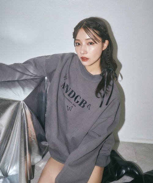 フロントにロゴ刺繍をあしらったスウェット。裏起毛であたたかく、オーバーサイズなのでコンパクトボトムにロングブーツ合わせがおすすめ。
