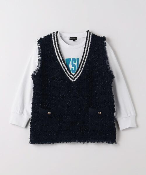 ツイードジレスタイルが楽しめるセットアイテム■デザイン大人トレンドでもあるジレスタイルをキッズでも♪ツイードのベストとロングカットソーのセットアイテム。それそれ単品で着用可能なのでコーディネートの幅が広がります。■素材ご自宅でケアできるため、普段使いしやすい素材です。■コーディネートタウンユースはもちろんのこと、インナーをお手持ちのブラウス等に変えることでフォーマル感が出るので、おめかしシーンにも活躍しそう。------------------------------------// POINT //「おなまえちけっと」付きーおさがりで名前の書き換えが必要になってもカットして新たに書き換えることができます!ーご使用方法:商品の内側脇に「おなまえちけっと」がついています。1からお名前を書いていただき、次使われるお子様は1をカットして2の箇所にお名前を記載して使用してください。3のお子様も同様に2をカットして3の箇所にお名前を記載して使用してください。------------------------------------============================裏地:なし透け感:Tシャツ あり伸縮:Tシャツ あり光沢感:なしケア方法:ベスト:手洗い可 Tシャツ:洗濯機洗い可============================【注意事項】※商品を使用前に、タグ等に記載されている「取り扱い上の注意書き」、「洗濯表示」を必ずご確認ください。※商品画像は、光の当たり具合やパソコンなどの閲覧環境により、実際の色味と異なって見える場合がございます。あらかじめご了承ください。※商品の色味の目安は、商品単体の画像をご参照ください。店舗へお問い合わせの際は、全国のgreen label relaxing各店舗まで下記の品名/品番をお申し付けください。品名:TJツィードニットVT+カットPO SET 品番:38121991938