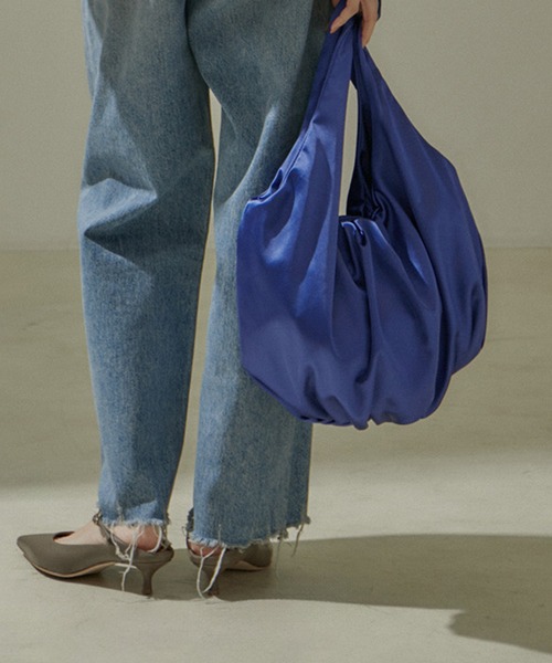 スタイリングのアクセントにも◎光沢感のあるサテン素材がワンポイントになるラウンドトートバッグ/ハンドバッグ■デザイン/シルエット シンプルながらもラウンド型のフォルムが際立つサテントートバッグ。 開口部が広いので荷物の出し入れがスムーズにでき、 メインバッグとしてはもちろん、サブバッグとしてもオススメです。 モードからカジュアルまでどんなコーディネートにも取り入れやすく、 横長で収納力のあるサイズ感も嬉しいポイントです。 ペットボトル/タンブラー/水筒や長財布、ポーチなど必要なものがしっかり入ります。 マグネット式で開閉も楽々。口が広く開くので使い勝手も抜群です。 内側にはポケット2つ付きで細かい物も収納可能。1つはファスナー付きです。 トレンドのメタリック要素を大人っぽく取り入れられるアイテムです。 上品な印象のグレー、スタイリングの差し色になる鮮やかなブルーと優しいピンクの3色展開です。 ■素材 上品な光沢のあるサテン素材を使用。 リサイクルポリエステルを使用しており、サステナブルな素材です。 肌なじみの良い柔らかい素材感です。軽量なので軽く持てるのも嬉しいポイント。 ----------------------------- ポケットの数:外0個、中2個 A4収納:不可能 *クリアファイルなど柔らかいものであれば収納可能、その際マグネットは閉まりません ショルダー紐:なし -----------------------------