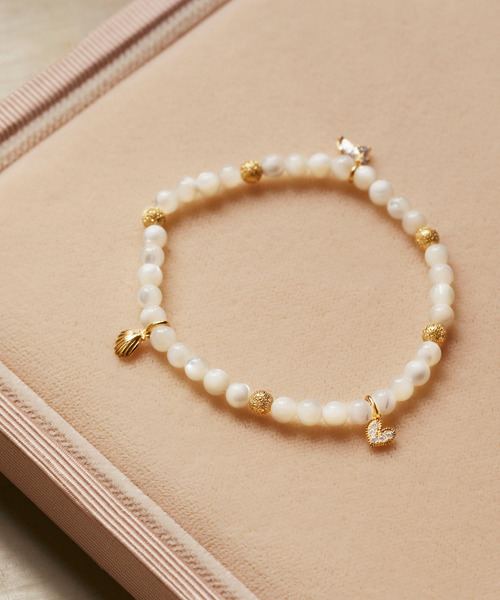 【マザーオブパールを贅沢に使用したブレスレット】 ハート、ビジュー、シェルパーツが等間隔に配置されており、どの面でも可愛いデザインになっています。 伸びるタイプのゴムを使用しておりますので着脱がとても簡単です。 お持ちのブレスレットや時計など重ね着けしていただくのがオススメです。 ※天然石の特性上、形や大きさ、色味に多少の個体差がございます。予めご了承ください。 ================================== ◆◆◆CISOLASSE/シソーラス◆◆◆ 温もりと気品のあるクラシックなデザインを軸に、 現代的なエッセンスを加えたこだわりのアクセサリーで、新しいエレガントスタイルを提案します。 ■ブランド名 ギリシャ語で“宝物庫”の意味を持つ言葉。 ■コンセプト Eau-blanc ―無色透明― 身に着けた人に寄り添う、しなやかな美しさ ==================================