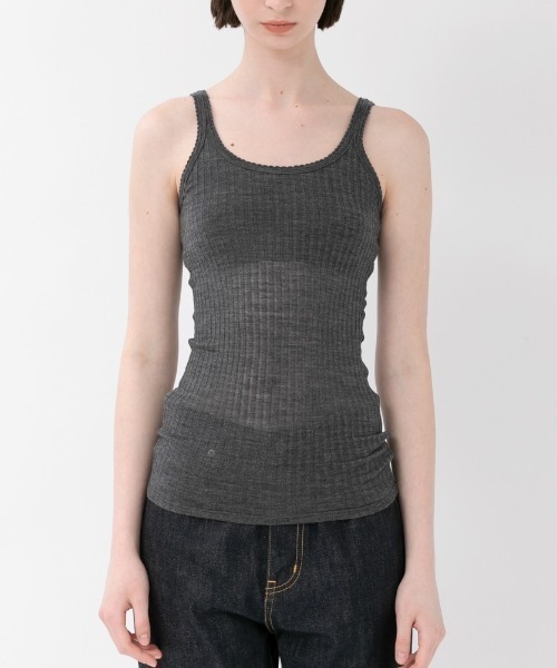 【デザインの特徴】 ・シンプルな背中あきのクルーネックタンクトップ ・女性的なタイトシルエット ・背中を綺麗に見せる深めのバックネックライン ・袖口・衿ぐり・アームホールに施した、子供服でよく用いられるシェルタック刺しゅうがポイント ・取り外し可能なブラカップ付き ・ノースリーブ ・ヒップ下丈 【素材のこだわり】 ・上質なメリノウールで繊細に編んだ針抜きテレコ ・針抜き部分がレースのような透け感のある素材 ・毛羽の無い滑らかな肌触り ・ウール特有のふんわりとした優しい風合いが特徴