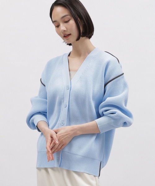 オーバーサイズのカーディガン。ドロップショルダーのシルエットにウエストまで隠れる着丈でゆったりとしたラフな着心地の1枚です。袖や後ろ部分にデザインされた配色デザインがアクセントに。Vネックデザインなので襟元がすっきりと見えインナー合わせも楽しめるアイテムです。【素材】アンチピリング、マシンウォッシャブル機能がついたポリエステル素材のニット。【スタイリング】プリントロンTと合わせるとカジュアルダウンしておすすめです。厚みのある素材感なので、春先は軽アウター代わりにも〇