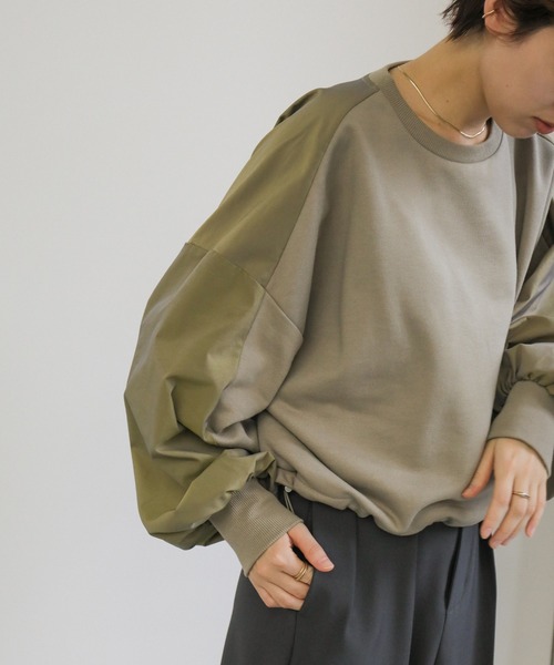 -point- & -styling- 表情の異なる素材コンビでそれぞれの良さを生かしたショートスウェット 背面は微光沢のシャツ生地を使用したカジュアルなショートスウェット。 身幅と袖周りはゆったり余裕のあるシルエットにして、 背面の切り替えも同系色でまとめているので大人カジュアルに取り入れやすいアイテムです。 たっぷりギャザーをあしらった袖口は、ふわりと丸みのあるシルエットでレディライクな要素をプラス。 裾のドロストコードでシルエットの調整が可能なので、好みのバランスに着こなせます。 丸みのあるシルエットなのでさらりと落ち感のあるワイドパンツや、ナロースカート合わせがおすすめ。 カーゴパンツやデニムにヒール合わせもかっこよくまとまります。 異素材ショート丈バルーンスリーブトレーナー ---------------------------- 素材 (前身頃)ポリエステル65%・綿35% (後身頃)ナイロン55%・ポリエステル45% ---------------------------- 伸縮性 (前身頃)★☆☆☆☆ (後身頃)なし 裏地 なし ---------------------------- ※モニター・環境等により実際の商品と多少色味が異なって表示される場合がございます。 予めご了承をお願いいたします。 ======================= ■袋梱包の為、染料による特有の匂いが抜けきれず、匂いがする場合がございますが不良品にはあたりません。 上記注意点での返品、交換はお断りします。ご了承の上お買い求めくださいませ。 ■本製品は生産過程におきまして色味、サイズ感等若干の誤差が出る場合がございます。予めご了承くださいませ。 ======================= 【お買いものをお楽しみいただく為に!】 ▼商品のお気に入り登録 完売カラーの再入荷通知や、ラスト1点の通知、セールの通知も受け取ることができます。 ▼ブランドのお気に入り登録 新商品や再入荷など、いち早くブランドのお得な情報を受け取ることができます!