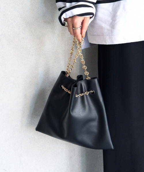 お得感をぎゅっと詰め込んだこちらのBAGは、トート持ち・巾着持ち・肩掛けと3WAYで楽しんで頂けます。繊細なチェーンはシンプルな本体に映えるようデザインにこだわり作成。ブレスレットのようなジュエリー感のある物をチョイスし、華やかな印象に仕上げました。普段使いにはもちろん、オケージョンシーンでも活躍するアイテムです。*店頭・屋外での撮影画像は、光の当たり具合で色味が違って見える場合があります。商品の色味は、スタジオ撮影の画像をご参照ください。