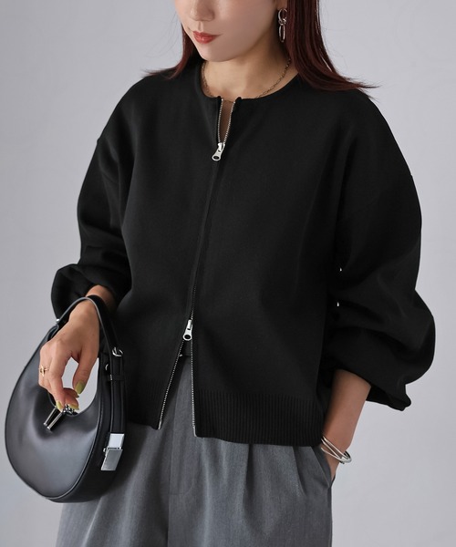 【Riberry スポンディッシュダブルジップカーデ】\オールシーズン大活躍のダブルジップカーデ/柔らかい生地感がきれいめにもカジュアルにも合わせやすい!スポンディッシュカーデ■Stylingふんわりと空気を含んだようなスポンディッシュニットで仕立てた、ダブルジップ仕様のノーカラーカーディガンが登場しました。柔らかさと軽さを兼ね備えた素材感で、羽織るだけでこなれた雰囲気を演出してくれる一枚。ゆるっとしたサイズ感で、デニムやラインパンツと合わせてカジュアルなスタイリングはもちろん、タイトスカートやスラックスなどきれいめアイテムと合わせてきれいめなスタイルも◎首まわりをすっきりと見せるノーカラーデザインは、タートルやハイネック、シャツなどとのレイヤードとも相性抜群。前を閉じればすっきりとしたトップス風に、上下から開ければ抜け感のある着こなしを楽しめる、ダブルジップならではのアレンジが魅力です。カジュアルからきれいめまで幅広いスタイリングに寄り添い、デイリーに活躍してくれる万能アイテム♪■Detailオフショルダーとボリューム袖でゆったりとした着心地。丈はウエストが隠れるくらいの着丈でボトムスとのバランスがとりやすいです。ダブルジップなので上下で開き具合が調節でき、すべて閉じればトップスとしても使用可能です。伸縮性もあり動きやすいのもポイントです。■Materialスポンディッシュ素材を使用し軽量ながら程よくハリ感のある素材。ストレッチが効いているので動きやすい素材です。保温性にも優れており、ロングシーズン着用いただけます。▽生地感透け感:あり 〇●〇〇〇 なし(白系ややあり)生地の厚さ:厚い 〇●〇〇〇 薄い裏地:なし伸縮性:あり※この素材は摩擦(特に湿った状態での摩擦)や雨、汗でぬれた際には他の衣料等に色が移ることがございますのでご注意ください。※詳しいお手入れ方法は商品タグをご参照ください。【Information】◆《お気に入り登録》がオススメ◆・「商品のお気に入り登録」で再入荷通知や、ラストの通知、セール通知も受け取ることが出来ます。・「ブランドのお気に入り登録」で新商品や再入荷など、お得な情報を受け取ることが出来ます※撮影時のライティング、太陽光、ご覧になっているモニター・PC環境により、実際の商品と色味が異なって見える場合がございます。予めご了承をお願い致します。