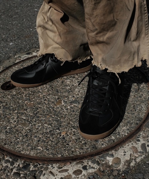 旧西ドイツ軍トレーニングシューズ(通称ジャーマントレーナー)は1970年代から80年代まで使用されていたシューズです。 ADIDASやPUMAなどの工場が製造していた事もあり、ミリタリーシューズの中でも名品として知られているシューズです。 様々なメーカー、ブランドによりサンプリングされているアイテムですが、当時のデザインをそのままにリプロダクト致しました。 シンプルで飽きの来ないデザインで様々なスタイルの合わせて頂ける永遠の定番シューズです。