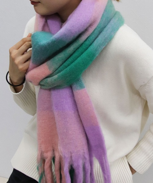 ■アクセントになるモヘア風チェックマフラー 【デザイン】 ふっくらと空気を含んだ、柔らかい質感のモヘア風マフラーは 程よい大きさがボリューム感を出してくれる優れもの。 カラフルなエッジをきかせたカラーからニュアンスカラーまでコーディネートのポイントに。 フリンジも太目でアクセントになります。 【コーディネート】 さまざまなコーディネートにバランスよく巻け、 アレンジがしやすいしっかりと長さのあるデザインでどんなものにも合います。 ご自身用にはもちろん、ギフトにも是非。
