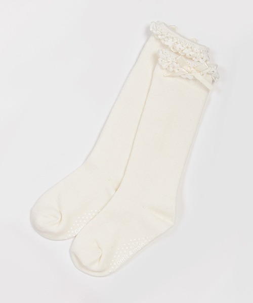 入卒式の装いにマッチするリボンつきハイソックスです。ひざ丈のワンピースと合わせやすい程よい長さの丈感がポイント。 はき口にはフリルも添えて、より女の子らしさを引き立てました。 柄物にも合わせやすいオフホワイトと紺の2色展開です。