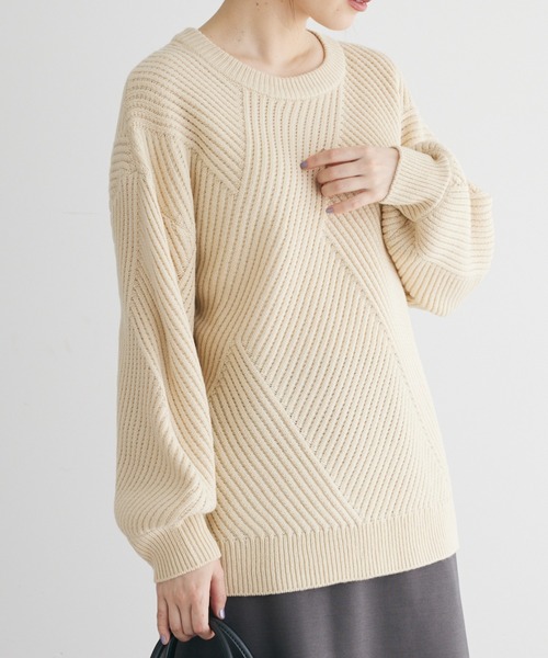 ランダム切り替えがメリハリ感をプラスするニット。 立体感のある編み模様でスタイリングにこなれ感を演出してくれます。 ふんわりとしたニットで着心地も快適。 1着でシンプルに着るのはもちろん、ハイネックやシャツをインに合わせたりと、様々な着こなしのアレンジも楽しめるアイテムです。 透け感[無し] 裏地[無し] 伸縮性[有り] 光沢感[無し] 生地の厚さ[普通] 付属品[無し] ポケット[無し] ●製品寸法: F:バスト56.5cm 着丈61cm 袖丈44cm 肩幅58cm 裾幅46cm 備考: