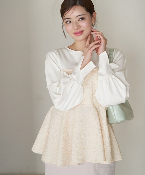 異素材切り替えで華やかさもぐんとアップのトップス。【素材感】 ・身頃にはしっかりとした生地感のポンチを使用。 【デザイン・シルエット】 ・ペプラムシルエットのビスチェをドッキングした、ロングスリーブカットソー。 ・カットソー部分はシャツライクなデザインで、ノーブルな着こなしに。 【カラー】 ・ブラック、アイボリーの合わせやすい2色をラインナップ。 【スタイリングポイント】 ・スカートならIラインが好バランス。 ・テーパードパンツに合わせてエレガントに着こなして。 ・同シリーズでKIDS(品番:GRE24050)も展開しているので、親子お揃いもおすすめ。 ----------------------------- 裏地:なし 透け感:ポンチ素材の部分はややあり 伸縮性:ポンチ素材はややあり 生地感・厚さ:普通 ウエスト:後ろシャーリング その他仕様:後ろボタン開閉可能、ファスナーなし 季節:秋・春 ----------------------------- ※撮影時の光、お使いのモニター環境によって色の見え方が違う場合がございます。 ※KIDSは一部店舗限定となります。 ※モデル身長:165cm 着用サイズ:38