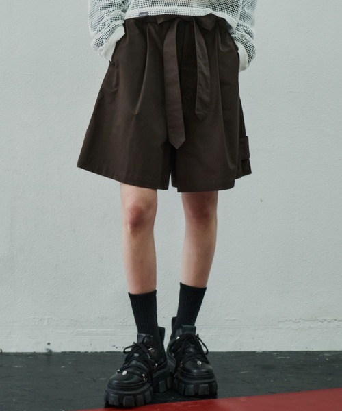 【AIVER ワイドフレアショートパンツ】パリッとしたハリ感のある上品な生地を使用。表は滑らかな質感でハリがありつつも柔らかくさらっとした軽い仕上がり。生地自体にハリがあるためヘタッとならずに台形の綺麗なシルエットが印象的。裾幅を広く仕立てたキュロットのようなワイドフレアショートパンツ。ウエストからヒップに掛けて綺麗に膨らむように前にタック、後ろに2本のダーツを入れた仕様。縦にスラッシュポケット、後ろには玉縁ポケット付き。裾サイドにはアジャストタブを取り付けトレンチのディティールを加えたデザイン。ベルトには共生地を用いて約190cmと長めの平紐を取り付け、好みの結び方やそのまま垂らしてアクセントにも。同じ生地素材でショートラグラントレンチコーチ(問い合わせ番号/ACBLC0224002)もあり、合わせて着た時にベルトの紐やアジャストタブがコートとパンツが重なるようなデザインのセットアップ。カラーはブラック、ベージュとダークブラウンの3色展開。※画像つきましては、光の反射によって実物と色味が異なって見える場合がございます。※繊維製品の為1~2cmの誤差がある場合がございます。予めご了承下さい。<商品のお気に入り登録>再入荷、残り1点、セールなどの通知を受け取ることが出来ます。<ブランドお気に入り登録>新商品や再入荷、ショップのおすすめトピックスなど、いち早くブランドのお得な情報を受け取ることが出来ます。