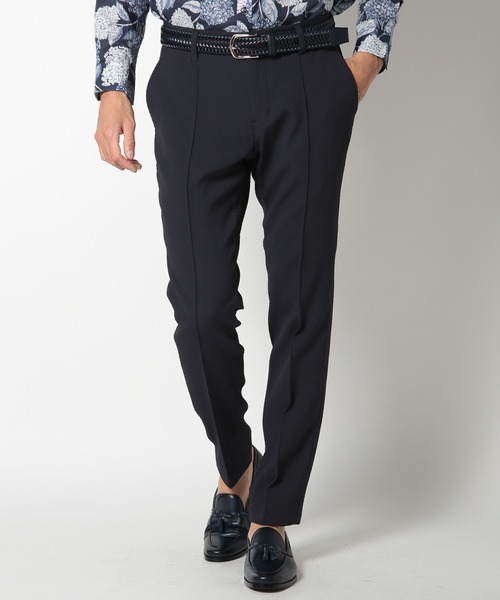【独特な質感がこだわりのヘリンボーンパンツ】 センタークリースと呼ばれる中央の折り目部分をミシンでつまみ、よりスタイリッシュに見える仕上がりになっております。 素材にはポリエステルを使用しており、ヘリンボーンのキルティング風の膨れジャカードが特徴的。 この膨れジャカードは、ヘリンボーンを立体的に表現し、独特の質感と外観を与えます。 細身のシルエットではあるものの、ストレッチ性のある素材を使用しているため、動きやすさと快適さを兼ね備えています。 同色同素材のジャケットと合わせて、セットアップとしてもぜひお試しください。 モデル 身長184cm 胸囲95cm ウエスト78cm ヒップ94cm 着用サイズ:03(L)