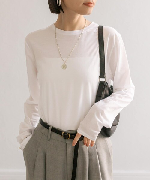 ニットインでも一枚でも着やすいシアーロンTが登場●デザインほのかな透け感のシンプルなロンT。ニットのインナーにも使いやすいように滑らかな天竺素材を使用しています。程よくゆとりのあるシルエットと長めの袖丈で、一枚でも着やすいサイズ感。バックスタイルには切り返しが入っているため、シンプルになり過ぎず、さりげないポイントに。ソフトな質感と程よい透け感が魅力の、一枚あると便利なアイテムです。●おすすめスタイリングアイテムヘアリーラグランVネックニットグリッターモヘアニットソモウタックワイドパンツスタンドカラーダウンジャケット●素材綿 77%ナイロン 23%・柔らかく肌触りのいい素材洗濯方法:洗濯機弱(40℃限度)透け感:あり裏地:なし伸縮性:あり生地の厚さ:ふつう光沢:なし--------------------------------------------------------------------------------【注意点】※画像の商品は光の照射や角度、お使いのモニター環境により、 実物と色味が異なる場合がございます。※入荷状況により、お届け予定が前後する場合があります。※お客様への発送が店頭販売より遅れる場合もあります。※追加生産商品は、一部の店舗、通販で販売中の場合がございます。 予めご了承下さい。--------------------------------------------------------------------------------