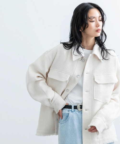 【 トレンドツイード 】ツイードレトロカラーブルゾン ■素材、機能 トレンドのツイードをメイズライクに度詰めにし無地カラーに落ち着かせています。しっかりとした厚みで安っぽくなく綺麗なシルエットを維持できる高見え素材です。 ■シルエット、デザイン レトロさを感じる広幅の襟にし、トレンドライク仕上げたブルゾンです。袖口、裾口は敢えてカットオフにしフリンジになるデザインにして古着ライクなイメージで大人っぽいツイードイメージをカジュアルダウンさせコーディネートに取り入れやすいデザインに落とし込んでいます。少し着丈を短めに設定しタックインコーデが映えるシルエットに設計しています。 ■カラー 濃淡で使いやすいカラーの2色展開です。 ■スタイリング ストライプシャツ+ネクタイを合わせるレトロな印象を出せる組み合わせがコーデがおすすめです。ワイドデニムと合わせてレトロなストリートスタイルも旬な組み合わせも相性抜群です。 裏地:なし 透け感:なし 伸縮性:なし 生地感・厚さ:厚手 ポケット:あり その他仕様:なし 重さ:930g 【モデル着用サイズ】 MEN:身長183cm 着用サイズL WOMEN:身長175cm 着用サイズL ※撮影場所やライティング、お使いのモニター環境によって色の見え方が異なる場合がございます。 ※商品のカラーは詳細画像の色味をご参照ください。