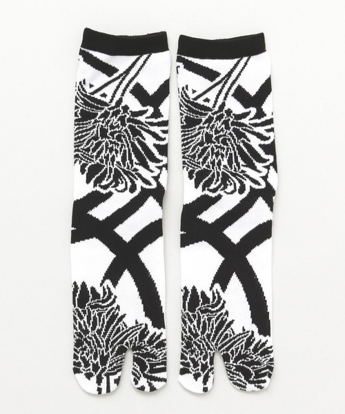 美しい和花、菊の柄をあしらった足袋型靴下。大胆ながらもシンプルな柄でモードな雰囲気に。【靴下の一大産地 奈良県で作られた足袋型くつ下】足にしっかり馴染んで履きやすい。足袋特有の履き心地。古くて新しい奈良の靴下。編み上がった靴下は筒状になっていて足先が縫われておらず、一足づつ手作業で指部分を縫っています。柄は機械で編めても、ここは職人の手でしかできない部分。工業的に見える製品でも人の手で作られていることを知り、あらためて温かさを感じます。--- JAPAN MADE ---◆カヤ◆古くから伝わる日本の伝統と新しい文化の融合。「新しいカタチの日本」に出会える倭物ブランド【カヤ】「文明開化」をテーマに、倭モダンで色彩あふれる刺激的な和雑貨を提案していきます。※こちらの商品は1点1点職人による手作りとなります。その為、形や色合いなど若干異なる場合がございます。あらかじめご了承ください。Amina Collection Co.,LTD.