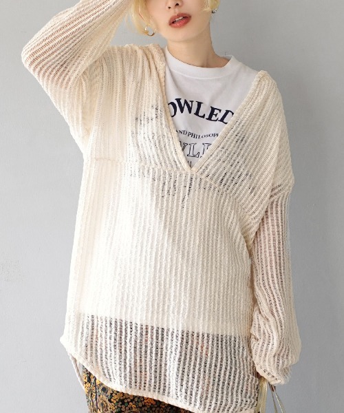 ニュアンスコーデを作る、抜け感メッシュプルオーバー 重ねるだけでニュアンスコーデが完成する、透け感が魅力のメッシュプルオーバー。 メッシュ編みの表情がヘルシーな印象を与えてくれます。 柔らかい肌触りで軽い着心地。 ゆったりとしたサイズ感なので、様々なアイテムに重ねて着用していただけます。 合わせるアイテムによって夏も冬も楽しめる、ロングシーズン活躍するアイテムです。 洗濯:手洗い可 ※アイロンの際はあて布をご使用ください ※お洗濯の際はネットをご使用ください ▼この製品は大変デリケートな素材を使用しています。激しい動きや強い力が加わると縫い目が開いたり、目寄れ(織り糸が滑り目が開く)する性質を持っています。着用時のベルト、バックル及び着脱時の時計・指輪等による引っ掛け、強度の摩擦ひきつれ等に十分ご注意下さいませ。 ▼ピリング(毛玉)が生じる場合があります。その際は無理に引っ張らずにハサミで取り除いてからご着用下さいませ。