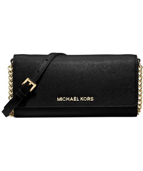 On-the-go yet ever glamorous, this MICHAEL Michael Kors signature wallet keeps your cards and currency safe with the added convenience of a gilded chain strap. Imported Saffiano leather Adjustable strap with 23"-25" drop Magnetic snap closure Exterior features gold-tone hardware, signature lettering and 1 slit pocket Interior features 1 zip coin pouch, 4 open pockets and 8 card holders 8" W x 4" H x 1"D Silhouette is based off 5'9" model