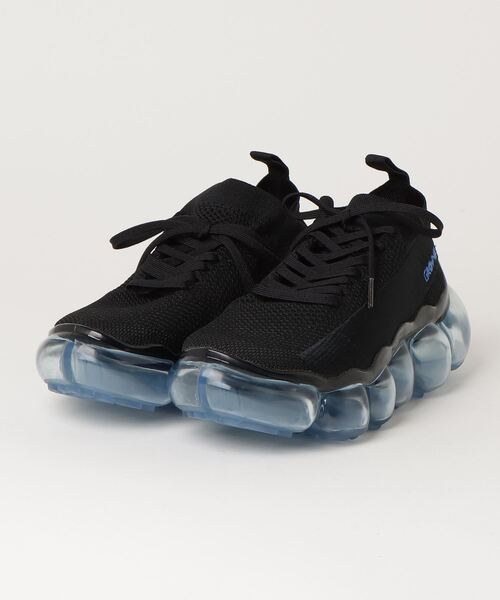 ROYAL FLASH 別注企画 宝石を思わせる透明な球体で作られた厚底のクリアソールは、履いている人や見る人の意識を足元に向けさせる。 それぞれの球体は足の動きに合わせて柔らかく動くように設計されており、独特な歩き心地とグリップ感があります。また、履いた時に最適なクッション性を感じられるように素材の柔軟性をコントロールすることで、手で触った時には感じられないような、フワフワと浮いているような感覚を演出してくれます。 特徴的な形状のアウトソールとは相反するようにシンプルに仕上げたニットアッパーは幅広いファッションと合わせやすいようにあえてミニマルに仕上げられています。 アッパーの一部はメッシュ構造になっていて、ソックスのカラーがデザインに反映されています。 別注でサイドにブランドロゴの刺繍入りのロゴテープを配置。 ヒール部分の高さはどのサイズも約5cm。 ボリュームがありながらも透明にすることで見た目の重さを軽減させているアイテムです。 grounds / グラウンズ MIKIO SAKABEを手がけるデザイナー坂部三樹郎が監修するフットウェアブランド。 「人間と重力(地球)の関係に変化をもたらすこと」「人間と重力(地球)の接点であるアウトソールと地面を中心とした人間づくり」をテーマに、ボリュームのある特徴的なアウトソールを組み合わせたフットウェアを発表しています。