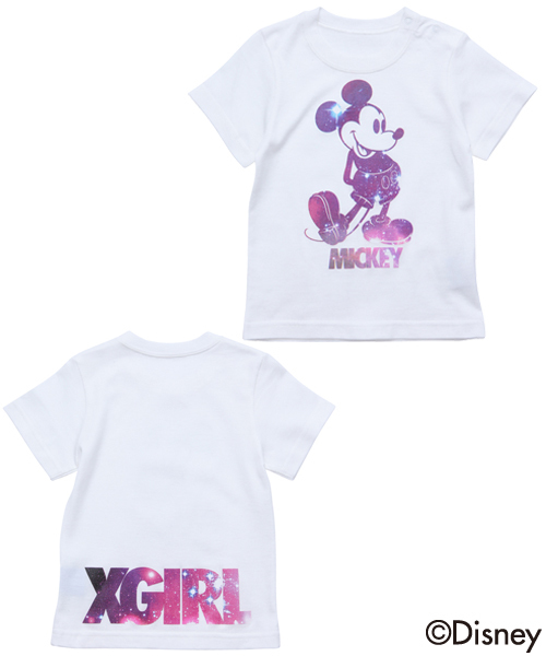 ミッキーマウスシルエットの中に宇宙柄を落とし込んだX-girl Stagesらしいデザイン。ロゴのバックプリントも宇宙柄でミッキーマウスとリンク!