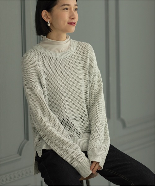 メタリック糸がトレンド感のあるメッシュ編みニットプルオーバー 【デザイン】 ・ゆったりとボクシーに仕上げたサイズ感で、抜け感のある着こなし可能なニットプルオーバー ・ボディはメッシュ編みのメタリックヤーンを使用し、表情のある仕上がりに。 ・衿ぐり、裾、袖口はリブ編みでしっかりした仕様にしています。 ・脇にはスリットを入れ、前後差のある着丈バランスに。 ・メッシュ編みで透け感があるので、タートルネックやタンクトップなど、インナー使いで幅広くレイヤードを楽しめる着こなしが可能。 【素材】 ・上品な光沢のあるメタリック糸を引き揃えたメタリックヤーンを使用 ・メッシュ編みで表情のある仕上がりに。 ・落ち感と滑らかな肌触りのレーヨン混素材 ・マシンウォッシャブルでご自宅でのお洗濯も可能 モデル情報:身長165cm B72 W57 H84 着用サイズ:38(M) 店舗へのお問い合わせ商品番号:637-18010 ●製品寸法: 36(S):着丈前48cm 着丈後54cm B106cm 袖丈43cm 肩幅51cm 38(M):着丈前50cm 着丈後56cm B110cm 袖丈44cm 肩幅53cm 40(L):着丈前52cm 着丈後58cm B114cm 袖丈45cm 肩幅55cm 42(LL):着丈前52cm 着丈後58cm B118cm 袖丈46cm 肩幅57cm 備考: