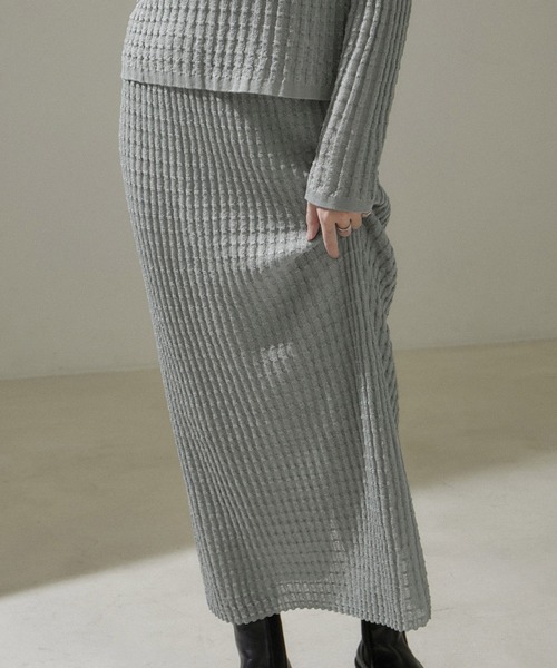 大人の女性にもオススメな程よいシアー感が楽しめるリブニットタイトスカート■デザイン/シルエット楽してキマる、表面感が新鮮な変形リブのタイトスカートです。柔らかな着心地の裏地付きなので裾のみ透け感を楽しめます。透け過ぎない、程よいシアーな素材感なので大人の女性にもオススメな1枚。立体感のある編み地で、フィット感がありながらも身体のラインや下着のラインも気になりにくいのも嬉しいポイントです。ウエストはオールゴム仕様でリラックス感のある着心地。後ろはバックスリット入りなので足さばきも楽々です。ニュアンスカラーのグレー、落ち着きのあるベージュ、シックなネイビー、鮮やかなレッドの豊富な4色展開です。■素材立体的な編み地が印象的なシアー感のある変形リブニット。ストレッチ性とシャリ感のある糸で、フィットしつつも快適な着心地です。■コーディネート同素材のリブニットとセットアップで合わせたワンピースライクなスタイリングもオススメ。カジュアルにTシャツと合わせたり、シャツやブラウスと合わせた異素材ミックススタイリングも素敵です。■セットアップで着用可能な同素材のリブニットプルオーバーもございます。商品番号:SHM24040商品名:【WEB限定】変形リブシアーニットプルオーバー【セットアップ対応】■モデル身長:170cm 着用サイズ:F(ショートヘアモデル)■モデル身長:172cm 着用サイズ:F(ロングヘアモデル)-----------------------------裏地:あり光沢感:なし透け感:裾部分ややありウエスト:ゴムポケット:なし伸縮性:あり生地の厚さ:やや薄手-----------------------------