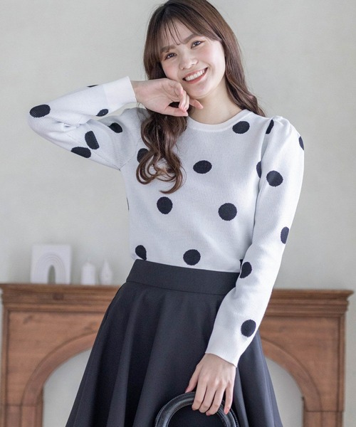 デザインが目を惹く!ドット柄ジャガードニットトップス【デザイン】大きめなドット柄のデザインがポイントになります!形がシンプルなので、コーディネートに取り入れやすいです◎ジャガードデザインなので、可愛すぎず大人っぽく着用していただけます♪【素材感】伸縮性のあるレーヨンニット素材伸縮性:あり/ 透け感:なし / 裏地:なし水洗いによる洗濯不可 / ドライクリーニング可【コーディネート】マーメイドスカートで女性らしいスタイリングにも、デニム合わせで大人カジュアルなスタイリングにもサマになります。【※お取り扱い上のご注意】1:モニター環境等により実際の商品と多少色味が異なって表示される場合がございます。予めご了承下さい。2:屋外で撮影された商品は、天候により多少実際のカラーと異なる場合があります。商品のカラーはトルソー(マネキン)の商品画像をご参照ください。3:濃い色の商品は、お洗濯や摩擦等による移染にご注意ください。4:末永くご愛用頂く為に、アテンションタグ・洗濯ネームを必ずご確認の上、着用又はお取り扱い下さい。5:生産時期により、色、サイズ、デザイン、素材の質感が多少が異なる場合がございます。あらかじめ御了承下さいませ。