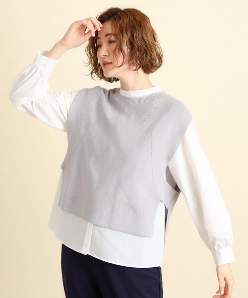 着回しの効く嬉しいセットアイテム ニットベスト×前開きシャツ 【デザイン】 簡単にコーディネートがキマるニットベストとシャツの時短セットアイテムです。 トレンドのクロップド丈に仕上げたニットベストにベーシックなシャツを合わせた今年らしいスタイルの1枚。 ニットベストはトレンド感ある丈感とゆったりしたサイジングがこなれ感を演出します。 ニットらしい編地変化をいれたデザインで、すっきりした見えがかりの片畦編みをメインにさり気ないイレットがデザインポイントになっています。 スタンドネックのややリラックス感のあるサイズに仕上げたシャツは、1枚着はもちろんレイヤードスタイルにもおススメのアイテム。 セットではもちろん、どちらも単品使いが出来るアイテムで幅広いスタイリングが楽しめる1枚です。 【素材】 ベストは綿タッチのアクリル糸を使用しているので、程よい温かみがありながら 表面は毛羽のないすっきりした見え方なので、春から秋冬にかけて比較的長く着用頂けます。 シャツはハリ感のあるローン素材を使用。 【スタイリング】 パンツ合わせが今年らしくおススメです。 細身のパンツ合わせでキレイメスタイル、ワイドに合わせるとカジュアルな着こなしが出来ます。 【24SS】 モデル情報:身長166cm B80 W59 H86 着用サイズ:02(M) 店舗へのお問い合わせ商品番号:768-18014 ●製品寸法: 01(S):ベスト着丈49cm ベスト肩幅38cm ブラウス着丈前62cm ブラウス着丈後65cm ブラウスB97cm ブラウス袖丈57cm ブラウス肩幅37cm ブラウスアームホール23cm 02(M):ベスト着丈51cm ベスト肩幅40cm ブラウス着丈前64cm ブラウス着丈後67cm ブラウスB100cm ブラウス袖丈58cm ブラウス肩幅38cm ブラウスアームホール24cm 03(L):ベスト着丈53cm ベスト肩幅42cm ブラウス着丈前66cm ブラウス着丈後69cm ブラウスB103cm ブラウス袖丈59cm ブラウス肩幅39cm ブラウスアームホール24cm 04(LL):ベスト着丈55cm ベスト肩幅44cm ブラウス着丈前68cm ブラウス着丈後71cm ブラウスB106cm ブラウス袖丈60cm ブラウス肩幅40cm ブラウスアームホール25cm 05(3L):ベスト着丈57cm ベスト肩幅46cm ブラウス着丈前70cm ブラウス着丈後73cm ブラウスB109cm ブラウス袖丈61cm ブラウス肩幅41cm ブラウスアームホール25cm 備考:
