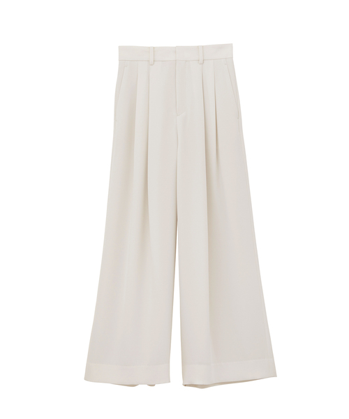 【素材】 上質で大人な雰囲気を醸し出す、シルクのような柔らかな光沢感とパウダリー感を備えた膨らみのあるトリアセテートダブルクロス。綺麗目な見え感ながらシワになりずらいシーズンレス素材です。 【デザイン・シルエット】 エレガントなマスキュリンなスタイルが決まるワイドパンツ。2タックのワイドレッグで、ウエストはマーベルト使いでメンズ仕立てにしています。タックでフロントにはゆとりがありますが、後ろは腰に綺麗に沿ったパターンでスタイル良くみえるようにしています。ヒップポケットはあえて付けず、身体に合わせてシルエットtが綺麗に出るように素材のドレープ性を活かしています。 【カラー】 アイボリー、限りなく黒に近いネイビーの2色展開 【おすすめのスタイリング】 LINTONツイードのジャケットと相性の良いシルエット、カラーリングにしています。毎日のオフィススタイルも素敵ですが、スニーカーだったり、あえてスウェットやTシャツを合わせて足元は女性らしいパンプス、等、合わせるアイテムによってシーンの巾が広いので色々なスタイリングを楽しんでいただきたいです。 ---------------------------- 透け感:なし 裏地:あり 伸縮性:なし 光沢感:なし 生地の厚さ:やや薄手 ポケット:あり 開き方:前開き 洗濯方法:手洗い ---------------------------- 【モデル情報】 モデル身長:168cm 着用サイズ:38 ※画像の商品はサンプルです。実際の商品と仕様、加工、サイズが異なる場合がございます。 ※撮影場所やライティング、お使いのモニター環境によって色の見え方が異なる場合がございます。 ※商品のカラーは画像の色味をご参照ください。動画は仕様説明のため、色味が実物と異なる場合がございます。