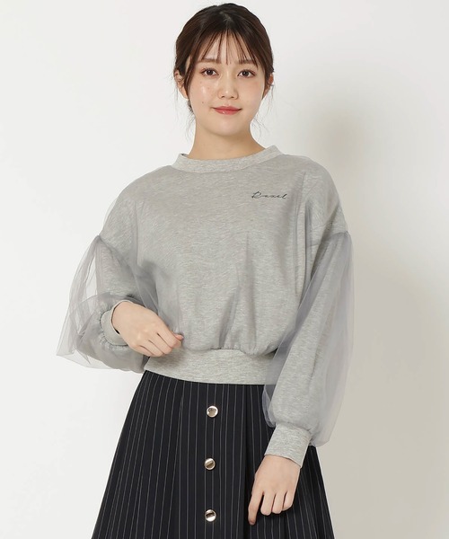 1枚でこなれ感たっぷりのレイヤードトップス ポンチ素材のプルオーバーにチュールを重ねた大人フェミニンを叶えるレイヤードトップス。 他ではあまり見ないレイヤードスタイルで、あったかさとこなれ感を演出してくれます。 胸元には筆記体で書かれたオリジナルロゴを配して、甘さをプラスしています。 ヒップ上が隠れるぐらいの丈感でごわつかずに着用していただけます。 チュール使いでフェミニンさも出してくれるので、カジュアルになりすぎず大人っぽく着こなせるアイテムです。 【styling】 ややボリュームのあるトップスなので、ミニスカートやショートパンツと相性が抜群。 ロングのプリーツスカートと合わせていただくと、フェミニン感を前面に印象付けることもできます。 デニムパンツやシンプルなスラックス合わせでボーズライクなコーデも楽しんでいただけます。 -------------------------- 透け感:なし 裏地:なし 伸縮性:ややあり 生地の厚さ:普通 --------------------------- F:着丈52cm バスト116cm 肩幅55cm 袖丈50cm