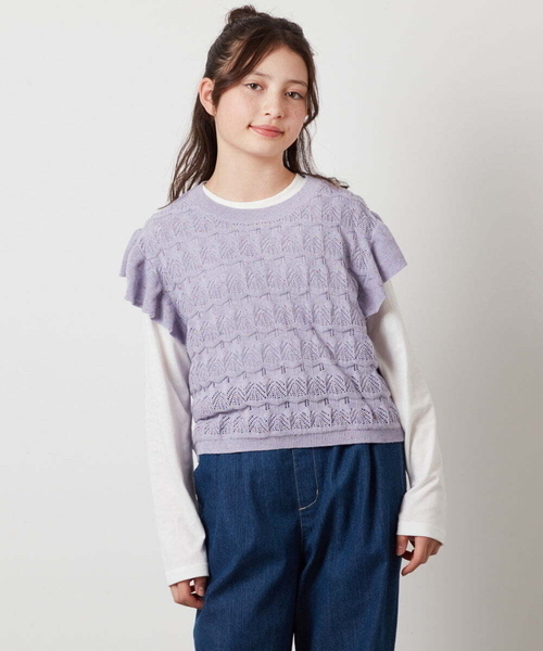 ◆袖のたっぷりフリルがかわいいニットベストとロンTのセット◆ 【デザイン】 ・ニットの素材がカラーネップが入っていてかわいいデザイン。 ・透かし編みが春らしく軽い印象に。 ・ボリュームのある肩のフリルが女の子らしくガーリー。 ・ショート丈なのでウエストすっきり見えするシルエット。 ・シンプルな長袖インナーがセットになっていて、別々でも着まわせる。 【素材】 ・ニットベスト…表面に立体感があるネップ調のニット素材。 ・インナー…伸縮性のあるカットソー素材。 【スタイリング】 ・Tシャツの裾をボトムにインしてすっきり着るのがおすすめ! ・インナーを変えれば夏まで楽しめるのでオールシーズンで着れる。 ・かわいいカラー展開なので、デニム合わせでおしゃれなスタイリングに。 【カラー】 ・ラベンダー…女の子人気の高いフェミニンなラベンダー。 ・アイボリー…ナチュラルで着回ししやすいシンプルなアイボリー。 ---------------- 透け感:ベストあり、インナー透けなし 裏地:なし 伸縮性:あり 光沢感:なし 生地の厚さ:普通 ---------------- ≪お気に入り登録機能の使い方≫ ■商品のお気に入り登録(ハートマークをクリック) 再入荷通知や値下げ等、お得なご案内を受けることができます。 ※WEB・一部店舗限定販売です。 ※同じデザインの140サイズ/150サイズ/160サイズがございます。 140サイズ/150サイズ商品コード:KJFEW30049 160サイズ商品コード:KJFEX30054 ---------------- ※素材の特性上、カラーネップは着用中の擦れや洗濯によって取れてきます。 ※サンプルでの撮影となるため、実際にお届けする商品と仕様やサイズが異なる場合がございます。 ※商品画像は、光の当たり具合やパソコンなどの閲覧環境により実際の色味と異なって見える場合がございます。 商品の色味の目安は商品単体の画像をご参照ください。