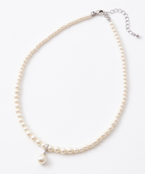 軽い付け心地の上品なパールネックレス。首元からトップにかけて珠を大きくすることで、首元をすっきりと見せつつ華やかに見せてくれるデザイン。 トップにはドロップパールと繊細なキュービックジルコニアをプラス。 さりげなく揺れるパールがエレガントな雰囲気を演出します。 お揃いのイヤリング(品番:0384-3-00700)とセットで付けるのもおすすめ。 結婚式や二次会などのパーティーシーンをはじめ、入卒やお子様の行事などのセレモニーシーンにも最適です。 一連のパールよりも少しアクセントが欲しい時にピッタリなアイテムです。 ※照明の関係により、実際よりも色味が違って見える場合があります。 またパソコン・スマートフォンなどの環境により、若干製品と画像のカラーが異なる場合もございます。 予めご了承ください。
