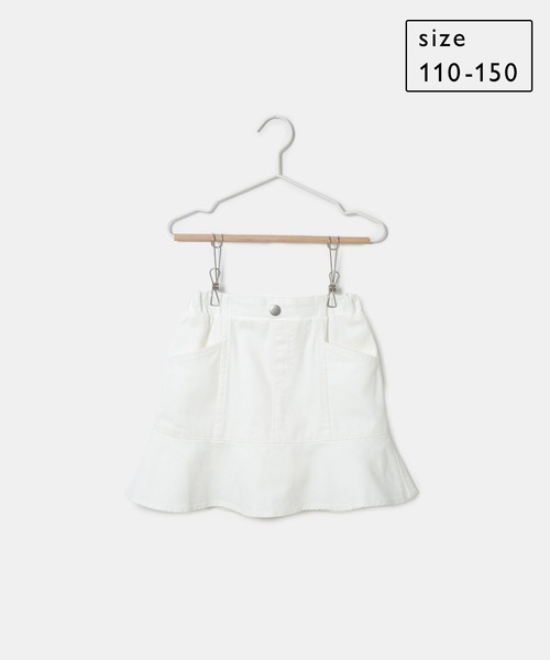 春にぴったりの着こなしが叶う。ガールズ用のホワイトデニム。 【デザイン・シルエット】 ・裾フリルの切り替えが可愛らしい、ホワイトデニムスカート。 ・着替えがしやすいウエストギャザーのプルオンタイプ。 ・フロントのフェイクボタンと切り替えで、トップスインもOK。 ・同シリーズでブルーデニム(品番:GRC24000)も展開。 【カラー】 ・ホワイトのみの展開。 【スタイリングポイント】 ・ビビッドカラーのトップスや、ボーダーシャツに合わせて爽やかに着こなして。 ・足元はハイソックス×スニーカーがグッド。 ・同シリーズで大人(品番:GSC14040)も展開しているので、親子お揃いもおすすめ。 ----------------------------- 裏地:あり 透け感:なし 伸縮性:ややあり 生地感・厚さ:やや薄手 ポケット:あり ウエスト:後ろゴム その他仕様:ボタンはフェイクです 季節:春~夏 ----------------------------- ※撮影時の光、お使いのモニター環境によって色の見え方が違う場合がございます。 ※DOG柄Tシャツの子:モデル身長:117cm 着用サイズ:120 ※ボーダーTシャツの子:モデル身長:116.5cm 着用サイズ:120