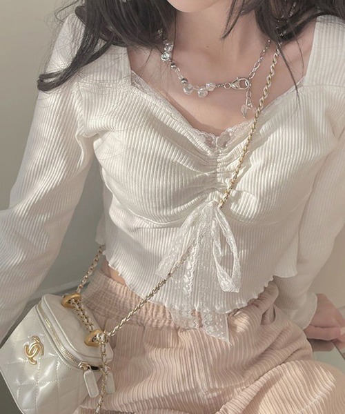 ■DETAIL フロントのシャーリングデザインとレースの編み上げが目を惹く、フェミニンなリブカットソー。 柔らかく身体にフィットするリブ素材を使用しており、程よいタイトさが女性らしいシルエットを演出します。 胸元のVネックラインには繊細なレースがあしらわれ、デコルテ周りを華やかな印象に。 フロントの紐を絞ることでシルエットのニュアンス調整が可能で、裾のメロウフリルが程よい甘さをプラスします。 ボトムスを選ばない絶妙な着丈で、デニムでカジュアルダウンしたり、スカートでとことんガーリーにまとめたりと、幅広いコーディネートに対応。 デイリー使いはもちろん、ちょっとしたお出かけやデートシーンにも映える一着です。 ◆POINT◇ 1枚でもインナートップスにも!着回しも、肌触りもよく柔らかいロンTです。 ハートレースがかわいい胸元のシャーリングがポイントです。 シアーが重なっているのでおしゃれに見えること間違い無し!Vネックでレースになっているので顔周りを明るくすっきり見せてくれます◎ パンツスタイルでスタイリッシュにスカートスタイルでガーリーに着こなすことができます! 【1色展開】ホワイト ▼POINT ・ロングT ・シャーリング ・y2k ・ショート丈 ・ガーリー ・きれいめ ・韓国ファッション ・シンプル ・デート ・26SS ・26年春夏 《 お知らせ 》 ▼商品のお気に入り登録 お気に入りアイテムの値下げ・再入荷・在庫1点などの通知を受け取ることができます。 ▼ブランドのお気に入り登録 新商品や再入荷、セール、クーポン配布などお得な情報を受け取ることができます。 是非、お気に入り登録してみてください! ※着用身長によって画像イメージと異なる場合があります。 ※撮影環境により、実際のカラー、形状、デザイン等多少異なる場合がございます。