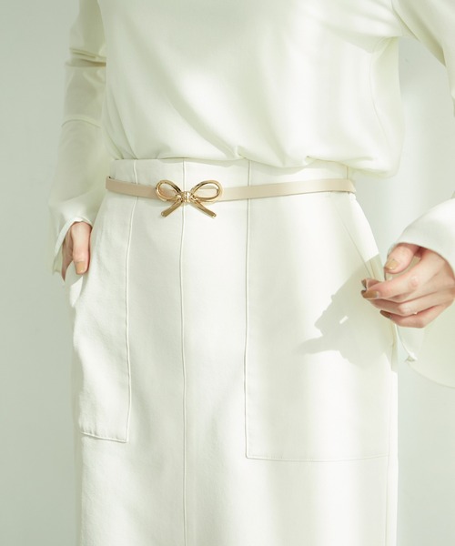 リッチなメタルリボンで上品な可愛らしさを演出して。 【デザイン・シルエット】 ・リアルなリボンを表現した、メタルバックルがアクセントのスライドベルト。 ・10mmの細幅で女性らしい仕上がり。 【カラー】 ・ブラック、アイボリーのベーシックカラー2色展開。 【スタイリングポイント】 ・フェミニンなワンピースにジャストウエストでつけるとクラシカルな着こなしに。 ・ロングカーディガンや、ビッグサイズのニット、シャツのウエストマークに便利。 ※撮影時の光、お使いのモニター環境によって色の見え方が違う場合がございます。