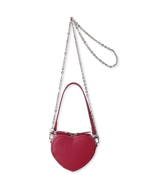 【スタイリングのワンポイントとしてアクセサリー感覚で取り入れたいハートポーチ】 【Design/Styling】 ころんとしたフォルムが愛らしい立体的なハートポーチ。リップなどの小物を収納できるミニマルなサイズ感は、マイクロミニバッグとしてアクセサリー感覚でお使いいただけます。表地はフェイクレザーで仕立て、中は起毛の生地を使い高級感のあるルックスに。ファスナーで一周ぐるりと開く仕様は出し入れがしやすく、内側には収納に便利なポケットが付いています。ハンドルとショルダー用のチェーンがセットになっているのでお好みでご使用ください。レッドとブラウンの大人かわいい2色展です。 ※サイズ表の数値は平均値の為、個々の骨格や体型によってはサイズが合わないと感じる場合もございます。 サイズに不安を感じる方はお近くのlingerie取扱い店舗での試着をお勧めいたします。 ※照明の関係により、実際よりも色味が違って見える場合があります。 またパソコン・スマートフォンなどの環境により、若干製品と画像のカラーが異なる場合もございます。予めご了承ください。 商品の色味は、商品単品画像をご参照下さい。 ※商品画像はサンプルのため、色味やサイズ等の仕様に変更がある場合がございますので、予めご了承ください。