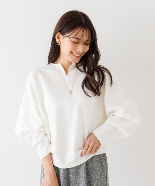 2WAYで楽しめるドルマントップス【Design】ソフトで張り感のあるダンボールニットのドルマンスリーブプルオーバー。短めの着丈で大人っぽく決まるドルマントップスです。前後着用可の2WAYで、キーネックとクルーネックの襟の違いを楽しめます。【Fabric】ダンボールニットという程よい厚みのカットソー素材はフォルム感が美しくお手入れも楽ちんです。毛玉になりにくいのも嬉しいポイントです。【Styling】ボリュームのあるボトムスと相性抜群。パンツコーデも袖にボリュームがあるのでかっこよく決まります。袖を持ち上げてドルマンのフォルムを強調するのも◎