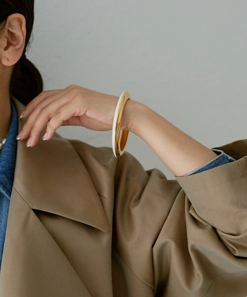 【2024SS】手元をモダンに彩る、コントラストを効かせたバングル■コンビカラーが特徴的な曲線の際立つバングル。■カラー樹脂を纏わせることでコントラストがモダンでユニークな印象に。■付け方よって見え方が変わり、表裏2wayで表情の違いを楽しめるのもポイント。■全て日本の職人によって手作業にてエポ(樹脂)入れを行っている、細やかさの光るアクセサリー。【COLOR】ゴールド:存在感のある華やかなゴールド。シルバー:肌馴染みの良い上品なシルバー。【MATERIAL】ゴールド:真鍮 + エポキシ樹脂。シルバー:真鍮 + エポキシ樹脂。― Hoaw.(ハァウ) ―日常にプラスするちょっとしたエッセンスその日の気分で…気負いなく、遊びの利いたムードをプラス気分はなやぐアクセサリー 季節になじむバッグ 足元を固めるシューズそれぞれの役割が重なって完成するファッション洒落の効いたファッションを楽しむ大人の女性へ向けて提案※画像の商品はサンプルです。実際の商品と仕様、色味が若干異なる場合があります。※入荷状況によりお届け予定が前後する場合があります。予めご了承ください。