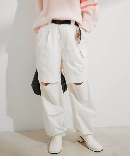 【デザイン・シルエット】 黒のベルトがついたナイロンカーゴパンツ。 <POINT> ・前太もも部分が開閉可能なデザインになっており、寒い時期にも少しだけ肌見せができます。 ・取り外し可能なベルトデザインがアクセントに。 ・キナリのみ太ももの開閉可能な位置の上まで裏地がついています。 【素材】 マットで触り心地が良いナイロン素材。 気軽に洗濯機洗いができるのも嬉しいポイント。 【カラー】 ベーシックなブラック・キナリにオレンジをプラスした3色展開。 【おすすめのスタイリング】 ゆったりニットを合わせるスタイリングがオススメです。 前裾だけINするような着方がすっきり見えて◎ ----------------------------- 裏地:キナリのみあり 光沢感:なし 透け感:なし 伸縮性:なし ウエスト:後ろ一部ゴム ポケット:あり 生地の厚さ:普通 季節:通年 ----------------------------- 【モデル着用サイズ】 全色モデル身長:160cm、着用サイズ:M ※画像の商品はサンプルです。 実際の商品と仕様、加工、サイズが若干異なる場合がございます。