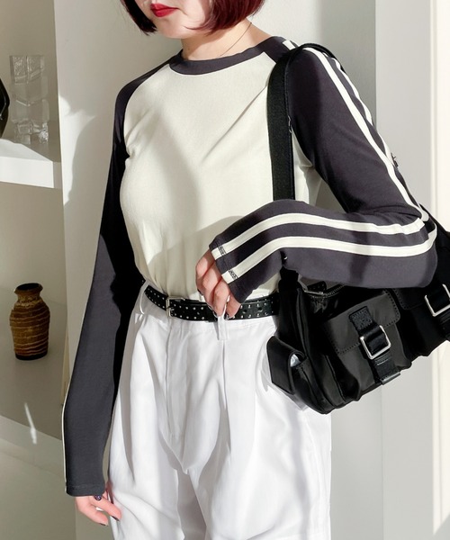 ーーー【デザイン】スリーブを配色にしたベーシックなラグランロンT。袖にはトレンド感のあるラインデザインをON。シンプルながらも他と差がつくアイテムに仕上げています。ーーー【スタイリング】ミニボトム×ブーツを合わせてヘザーらしい韓国っぽコーデがおすすめです。すっきりとしたシルエットなので、インナー使いにも◎※屋外の光や照明の当たり具合で、実際の商品と画像の色味に違いが発生する場合がございます。