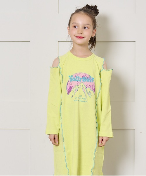 【BIG FIELD】 ショルダー部分からチラ見せ♪ 肩がチラッと見えるのが可愛い♪ フロントと裾のメローの配色も◎ フロントプリントもインパクト大! サラッとした薄めの生地感です。 1枚で主役になるワンピースなので、重宝します。 まだ肌寒い時期は、インナーをカタアキ部分からチラッと見せ☆ ※左右両サイドにポケット付き ■モデル着用アイテム ソウガラフルタケレギンス:0010141004