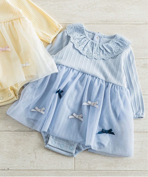 襟ぐりにぐるっとほどこした綿レースの襟がキュートな長袖ボディミニ。 ふんわり広がるラメチュールのスカートやスカート部分にポンポンとあしらったグログランリボンでフェミニンさをプラスしました。 さり気なくきらめくチュールスカートのラメがアクセントになっています。 フロント部分がキレイに見えるように後ろあきのデザインです。 デコボコしたウネが印象的なテレコ素材は伸縮性があり、肌触りがよくて着心地がいいからベビーもニコニコ笑顔。 デイリー使いはもちろん、きちんと感も兼ね備えているアイテムなのでちょっぴりおめかししたい時にもピッタリな1着です。 1枚でロンパースとしても、ボトムを重ねてトップスとしても様々なコーデを楽しめます。 春夏にピッタリな1着でお出かけを楽しんでね! さわやかなブルーグレー、パッと華やかなクリームイエローの2色展開です。 2024年春夏女の子アイテム。 【SLAP SLIP(スラップ スリップ)】 ~子どもの欲しいをカタチに~ ヨーロッパのこどものように 子どもらしい今しか着れないナチュラルなかわいさを提案 どこか上品で清楚感漂うフレンチカジュアルは いつものコーディネートをさりげなく格上げ