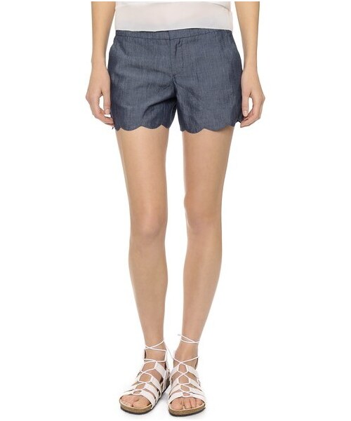 These puckered Club Monaco shorts have a scalloped hem for a sweet finish. Slant front pockets and button-welt back pockets. Hook-and-eye closure and zip fly. Fabric: Seersucker. 100% cotton. Wash cold. Imported, Vietnam. Measurements Rise: 8in / 20.25cm Inseam: 4in / 10cm Measurements from size 2