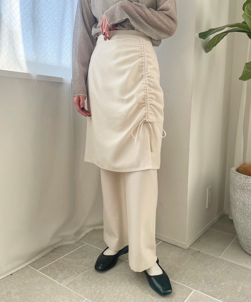■素材■ 程よい光沢と軽さが特徴のジャージ素材を使用。 適度に厚みもあり、シワになりにくく取り扱いが簡単です。 ■デザイン■ トレンドのスカートとパンツがセットになったアイテム。 スカートはドロストデザインを施すことで今年らしい印象に仕上げました。 パンツは裾が少し広がった微フレアのシルエットにすることで、レイヤードしてもスッキリと着用できるようになっています。 適度なフィット感があるシルエットなのでパンツ単体でも使いやすく、スカートもデニムなどの他のアイテムとレイヤードしてもお使いいただけます。