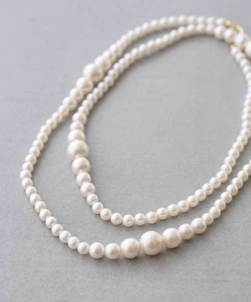 ■アイテム大きさの異なるパールを使用したネックレス。樹脂パールでできていて、ロングネックレスの中に大き目のパールが4か所ついています。コーディネートにあわせて、二連にして長さを短くするのもおすすめです。留め具部分はマンテル(トグル)にバーを通す形で、小さなフックの留め具が苦手な方にも取り付けやすいデザインです。■素材※着用時は、必ず取扱い表示・タグをご確認の上、お取り扱い下さい。素材:樹脂パール・真鍮《予約商品について》・サンプルの為、素材情報、洗濯表示については企画段階の情報を記載しております。公的機関での試験データ結果を受け、量産にあたり混率や洗濯方法の変更が発生する場合がございますので、ご了承くださいませ。・サンプルでの撮影、計測をしております。商品の仕様が一部変更になる場合がございます。・撮影サンプル品はブランドタグがついておりません。製品にはタグがつきますので、製品の表に縫い糸が見える場合がございます。・工場の生産の都合上、納期が変更になる場合がございます。検品や輸送の関係で、発送日が前後しますのでご了承ください。また、入荷状況により、お客様への発送が店頭販売より遅れる場合もございます。・店頭に陳列していた商品も含まれる場合がございます。《商品画像について》ご覧頂いている商品の写真につきましては、できるだけ実物の色に近くなるように努めておりますが お使いの環境(モニター、ブラウザ等)の違いにより、色の見え方が実物と若干異なる場合がございます。 予めご了承ください。《ハートをタップして商品のお気に入り登録》登録カラーの商品の「残りわずか」「再入荷」「値下げ」通知を受け取ることができます。