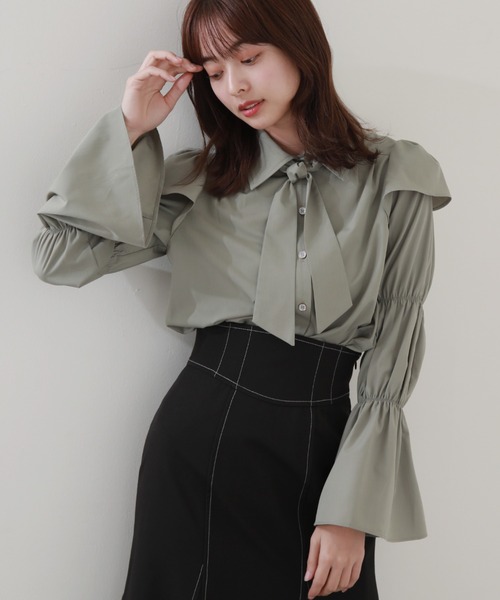 【デコラティブな袖デザインが今っぽい!シャツブラウス】■商品ポイント・シャーリング使いで目を引くキャンディースリーブに仕上げた袖のデザインがとにかく可愛い!シャツカラーとネクタイ風のリボンできちんと感もプラスし、他にはないデザインに仕上げました・春らしい綿タッチの風合いで、シルエットが綺麗に出ます。さりげないシルバーサークルのボタンも良いアクセントに♪・タイは取り外せるので、合わせるアイテムによって着こなしの変化を楽しめます■カラー・OFF WHITE…春らしい明るめの爽やかな色味・SAX…明るめのブルーベースに白のストライプ柄・KAHKI… 女性らしくお洒落見えするライトカラーのくすみカーキ■オススメスタイリング・Cheekイチ押しはキャミワンピースのインナー使い♪・ドラマテックなフレアスカートや、カジュアルな気分の日はデニム合わせもおすすめです■素材素材:【アクリル】40%【綿】30%【ナイロン】30%■モデル身長165cm / 着用…Mサイズ※撮影場所やお使いのモニター環境により若干お色味が異なる場合がございます。※画像の商品はサンプルです。実際の商品とは仕様・加工・サイズ・素材が若干異なる場合がございます。■商品のお気に入り登録■ラスト1点の通知やセール通知、また完売していても再入荷時に再入荷通知を受け取ることができますので、是非ご登録ください♪